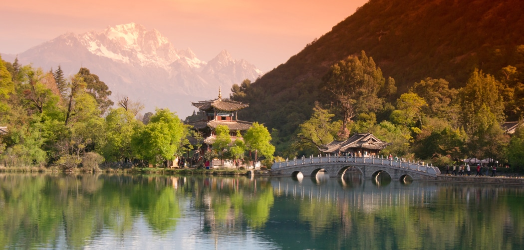 A white oriental bridge in front of the Chinese pagoda by a lake with the Jade Dragon Snow Mountain as the background, this is the Black Dragon Pool in Lijiang. Water in the lake is so still that reflects the whole image from above upside down. There is a small single pavilion standing in the middle of the lake. With the perfect reflection from the water, the pavilion is looking like flowing on glass.